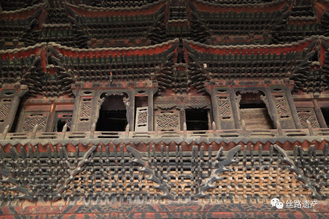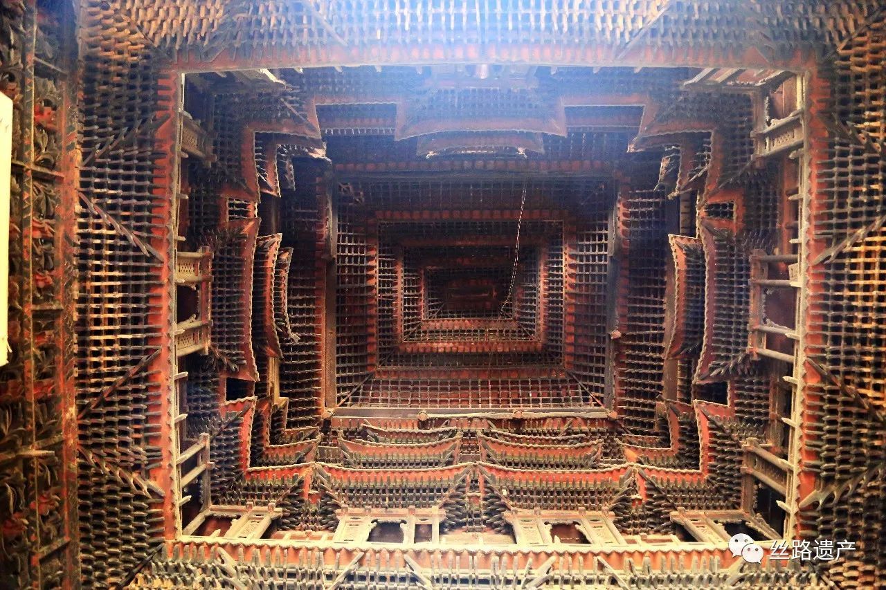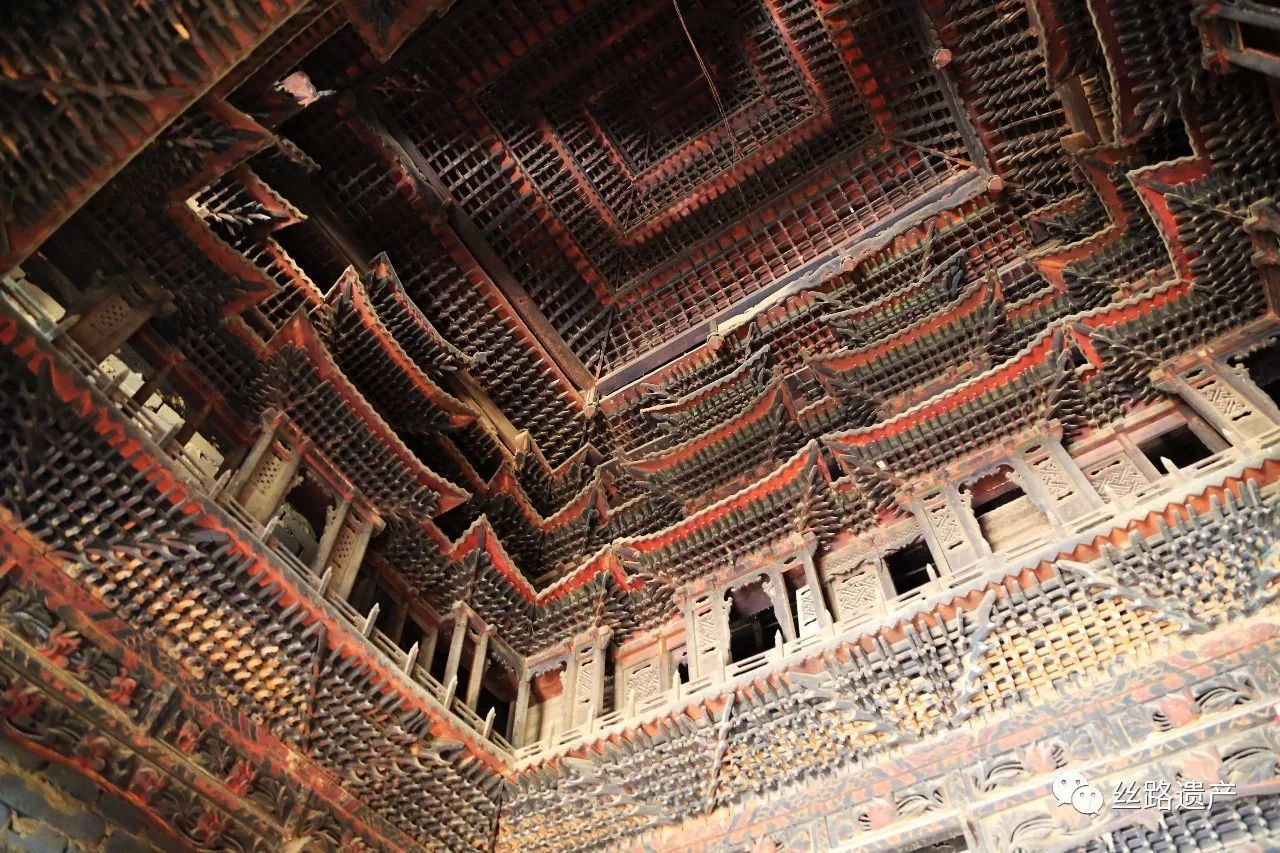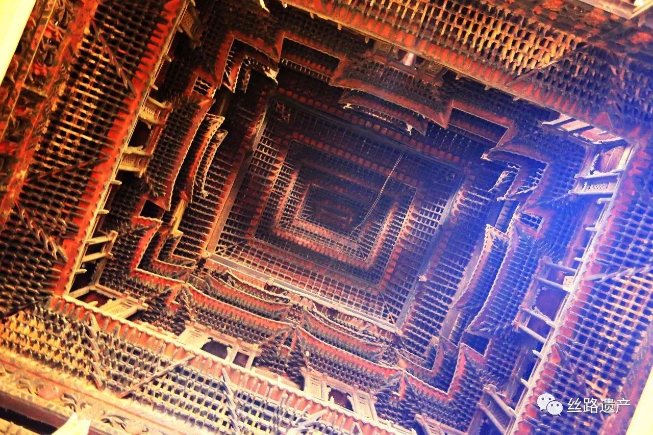 楼楼列列,层层叠叠,在213个楼阁、角楼下方,屋顶底部为一圈佛龛,整个阁楼显示的便是宇宙浩荡。处在其下方,抬头看到的是各种建筑构件,塑造了一种人们想象中天宫的景象。