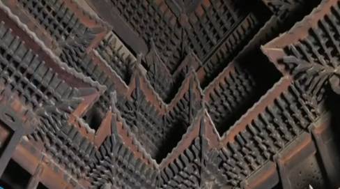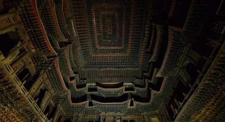 在总共只有95平米的屋子的顶部,就是最著名的天宫楼阁,共有3层,16个藻井, 并叹为观止的容纳下了近10万个木构件!天宫楼阁及藻井均按正常尺寸的1/30缩成建筑模型状,计有楼阁137栋,斗拱样式20余种。别看他建筑面积不大,但工艺却十分繁琐,而且楼阁重叠无数,几乎展示了我们现在能看到的所有建筑样式,正所谓“麻雀虽小,五脏俱全”。