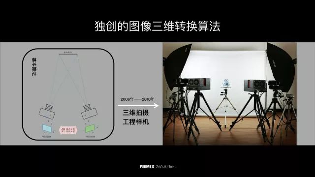 在2006年,我们的一个小团队掌握了一个自己独创的技术,即通过解析两个空间点获取的图像之间的位置关系,推断出像素点一个Z方向的数字,把像素点还原成三维点云,再将三维点进行面片处理后,组成物体的实体模型。