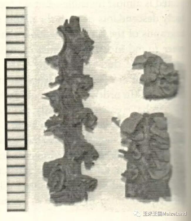 上图中展示的三个玉米芯残块几乎就是该遗址所发现的全部玉米(一共发现四块),而这区区三个残块的形态特征就足以告诉我们这三块都已经是“栽培玉米”,却还保留了类蜀黍的些许特征。“栽培“表现在既已成熟的玉米粒还连接在玉米芯上,而不是像野生的那样成熟后籽粒自动脱落入土中得以繁衍后代;而残存的类蜀黍特征在于,其中的三个残块仅有两列玉米粒,远少于现代玉米的四到十二列,而其玉米粒的颖片也较之现代玉米更长且硬。