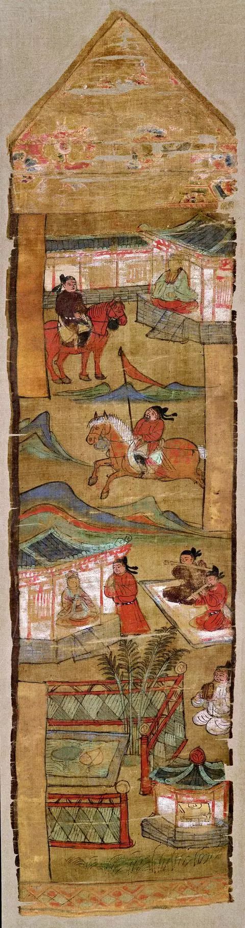 现存大英博物馆的敦煌出土佛幡绘画《佛传图:净饭王派遣使者、寻找、信使返回》是9世纪的作品,图中山川见策马的使者接头戴“软裹”幞头,两条扎脚飘于头后,身着圆领窄袖长袍。