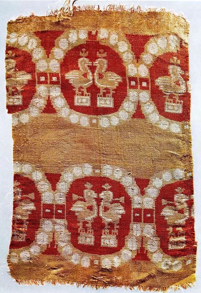 现藏北京故宫博物院的阎立本《步辇图》中禄东赞所穿的圆领窄袖袍,与敦煌现存的吐蕃时期壁画中常见的袍服形式相似,这种袍领所描绘的就是红地连珠鸟纹锦。出土唐锦中涉及团窠花纹的有不少,这其中尤以中间填鸟纹的团窠最为常见。
