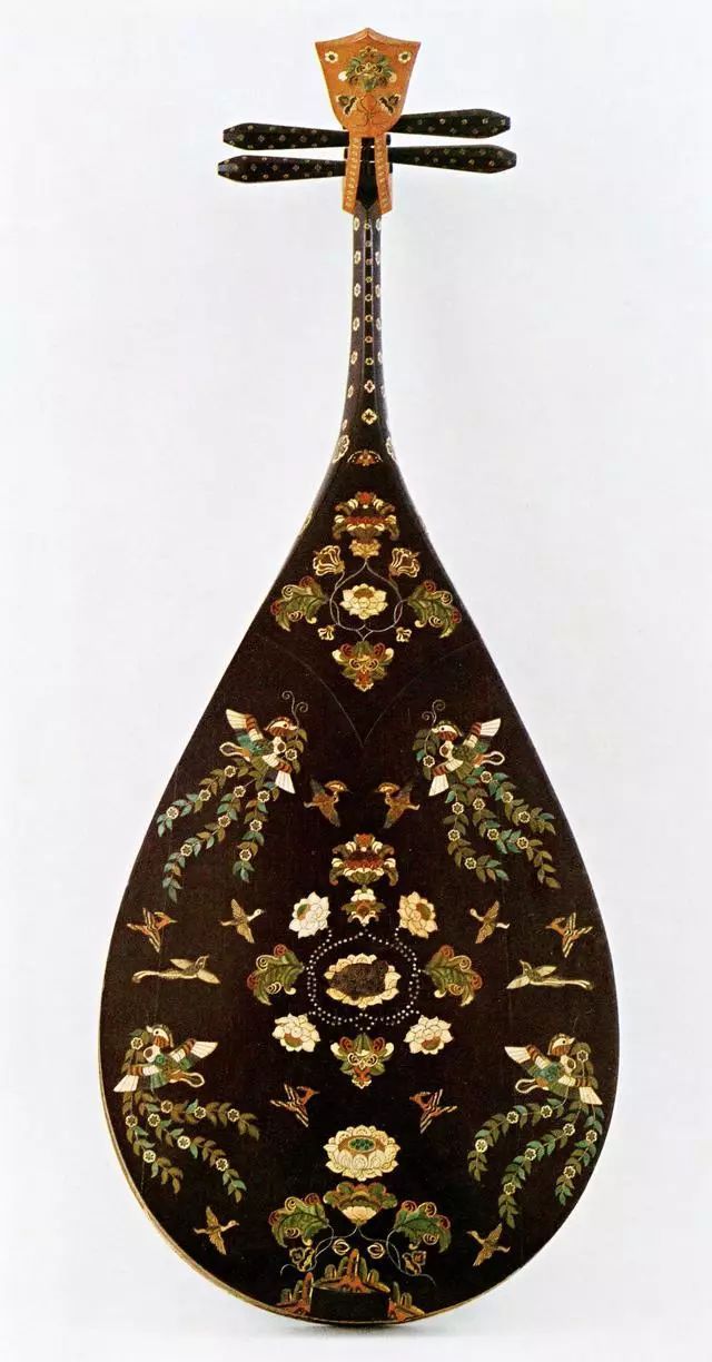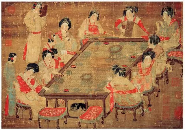 传统团窠动物纹饰的粟特风格织锦在中国流行时间颇长,在团窠包裹动物纹样的组合成熟之后,团窠形式逐渐抛弃原有的圆形构图,开始向更为灵动飘逸的形式发展,这其中尤其以樗蒲形象的相对动物鸟兽纹样最为突出。樗(音同“出”)蒲样式也见于台北故宫博物院藏唐人《宫乐图》中,画面前景左侧搭坐于桌角边正捧盏饮茶的仕女高腰裙上,依稀可辨朱红色游丝描般细腻的樗蒲纹样。