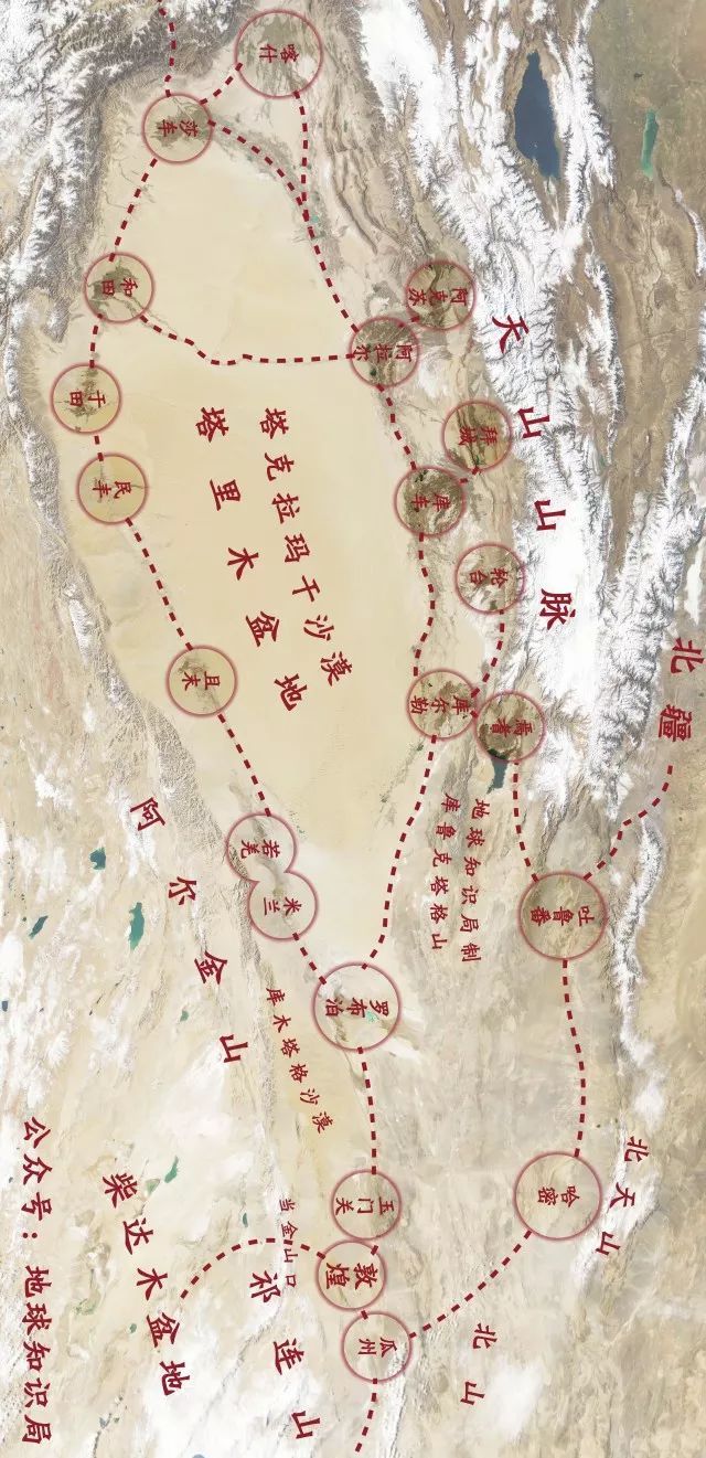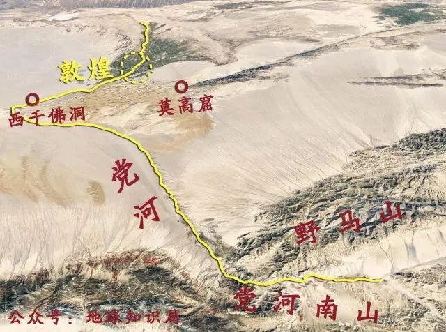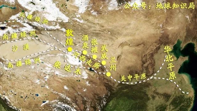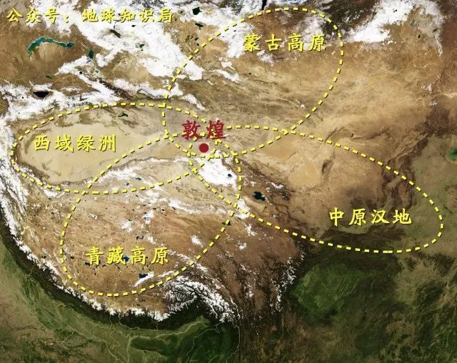 这种东西向走廊通道地形是河西走廊向西的延伸,但是这样的延伸也差不多止步于敦煌。西面的塔克拉玛干沙漠是不易穿越的地形阻隔。敦煌于是成为了河西走廊通往西域的最后一个节点,这里往东西南北四个方向分别通往汉区、南疆、柴达木和北疆,天然就是丝路的枢纽。