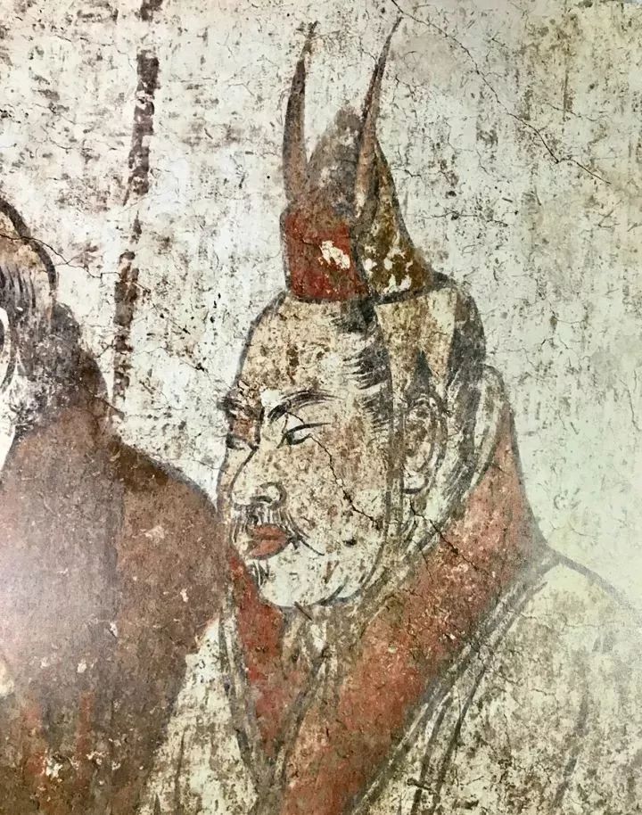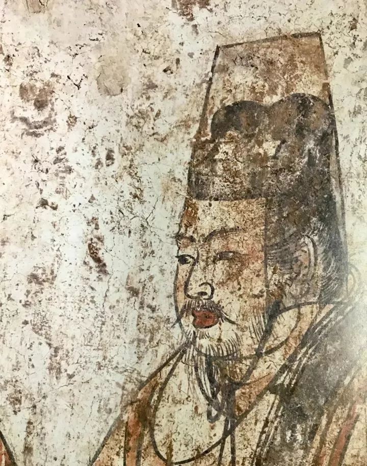 后面3位为外国使节,拱手躬身,毕恭毕敬。为首者秃发蓄髭,浓眉深目,高鼻阔嘴,身穿翻领紫袍,腰间束带,足穿黑靴,推断应为来自东罗马的使节。