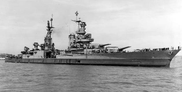 “印第安纳波利斯号”沉没是美国海军历史上最大的灾难事件之一,1945年7月16日,这艘“波特兰级”重型巡洋舰离开了旧金山港口,舰上有1196人,这艘军舰最后的任务是驶抵北太平洋天宁岛一个海军基地,运送原子弹“小男孩(Little Boy)”组件,最终这颗原子弹投掷在日本广岛。任务完成之后,这艘军舰沿着规定航线行驶,7月30日被一艘日本潜艇发射的鱼雷击中。“印第安纳波利斯号”在短短12-15分钟之内就开始下沉。
