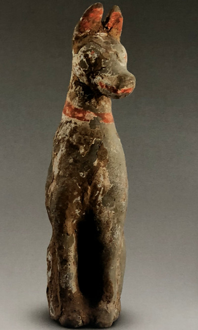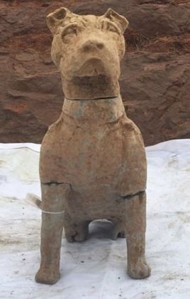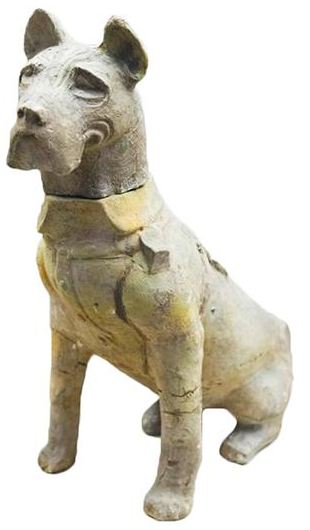 汉代人讲究“视死如生”,陪葬品的多少象征着墓主生前的地位及财富,正因如此,在厚葬盛行的汉代,陪葬品在数量、种类和规模上都是空前的。汉代墓葬中出土了大量的陶俑和陶制动物,其中陶狗极为普遍,这一方面反映了当时人们对狗的需求,另一方面也和商周时期用犬殉葬有一定关系,汉代已基本不见人殉和牲殉转而由陶俑来代替。这些陶狗在陕西、河南、山东、四川等地的汉墓,特别是东汉墓中大量出土,其形象可爱程度不同于一般家畜。对于这种现象,有学者认为:汉时由于政局相对稳定,经济长足发展,所以到了东汉时期,狗的用途发生巨大改变,由取肉食用的家畜逐渐变为看家护院的伙伴或者宠物。如山东临淄山王村汉代兵马俑坑中出土狗俑4件,出土时色彩均保存完好,泥质实心,手制而成,四件形态各不相同,有的为趴姿、有的为蹲姿。