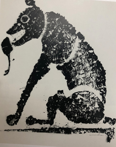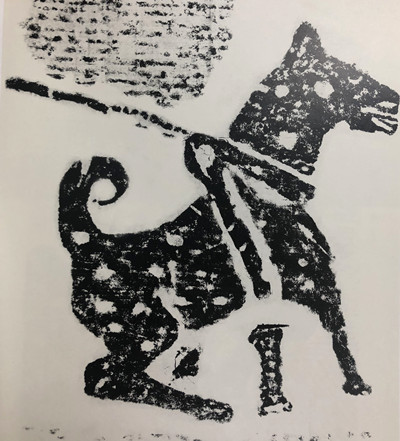 狗的身影还经常出现在汉画像石和画像砖上,在狩猎、出行、神话、庖厨等场景中狗扮演着不同的角色,可见狗在人类社会活动中占据着相当重要的地位。如四川乐山柿子湾崖墓出土的画像石上一犬颈套环索、昂首竖耳蹲坐、张口惕励门户;除了常规题材外,四川三台郪江崖墓画像石上刻有一只“立耳、健壮,前肢直立,后肢弯曲呈蹲坐状,双眼炯炯有神的狗”,罕见之处在于其口中叼着一只老鼠,整理者将其命名为“狗咬耗子”,至于其含义,有学者解读为“守犬”。