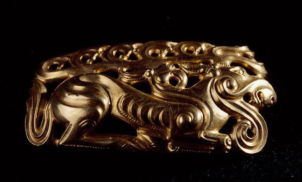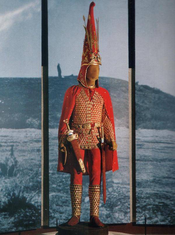 这位头戴高冠的黄金武士让我忍不住想象那位英雄玛纳斯的模样。在代代相传的传说中,他是位雪山般健壮的英雄,跨坐纯金马鞍,身穿箭射不透的战袍,腰佩阿恰勒巴热斯的双刃宝剑,手挥色尔矛枪和月牙战斧,头顶闪动着阿勒普喀拉神鸟的光辉,怒吼声盖过四十头雄狮,如月亮战神落到战场上。