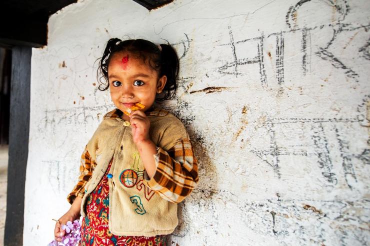 在加德满都的杜巴广场,遇到一位独自玩耍的小女孩,我上去给了她一些零食,她自然的就站好了让我给她拍照。