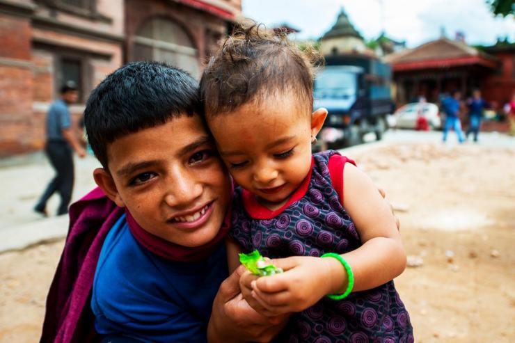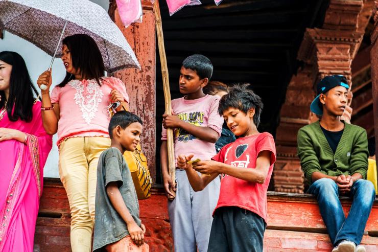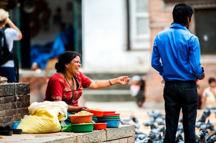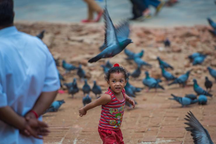 加德满都的杜巴广场旁,一位妇女在向游客兜售喂鸽子的食物,她的儿子和女儿都很小,在一边玩耍。
