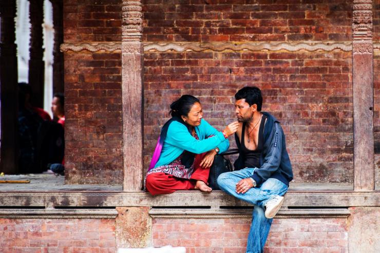 加德满都杜巴广场,休闲的下午,一对夫妻,妻子在为丈夫整理胡子。