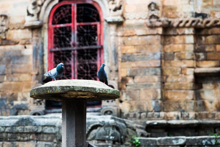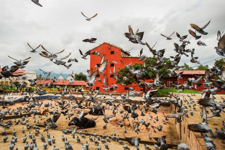 加德满都烧尸庙的一个小广场,鸽子被游客惊吓,纷纷飞走了,但过一会,它们都会回到这里。