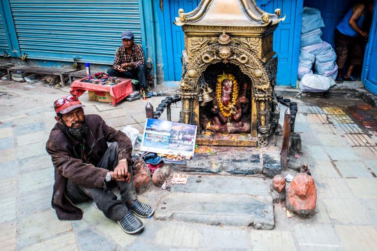 在通往加德满都杜巴广场的路上,一个流浪者,安详的坐在一个神像面前。