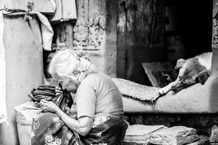 一位老太太坐在自家门前缝补衣物,她的眼神已经不太好使,使得她的动作更加小心翼翼。旁边慵懒享受着阳光的大黄狗,与之为伴。