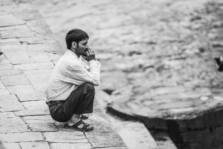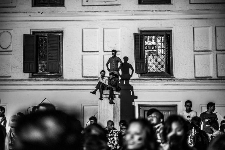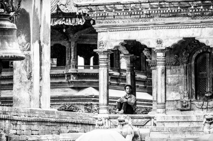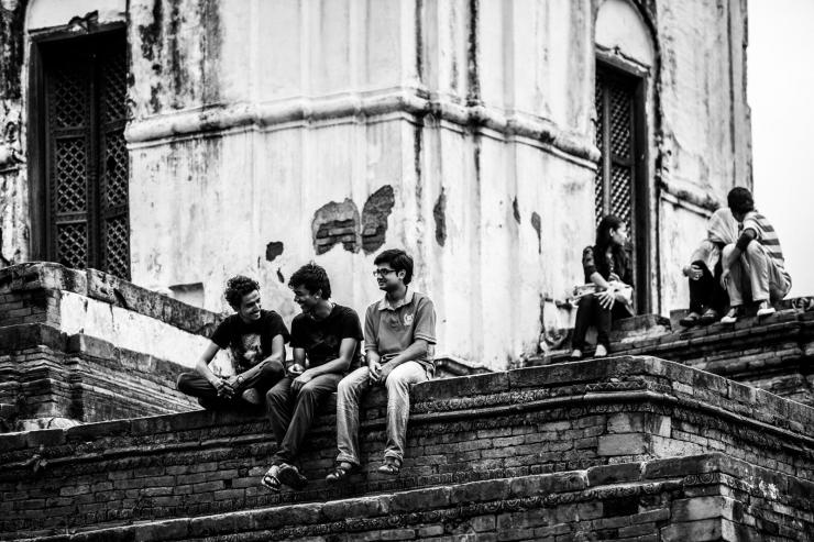 加德满都的杜巴广场旁,坐在神塔发呆的人们。