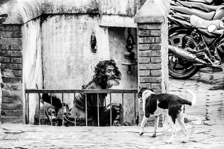 帕坦的杜巴广场,一位苦行僧和一条流浪狗的互动,让我的心里,感觉到无比温暖。