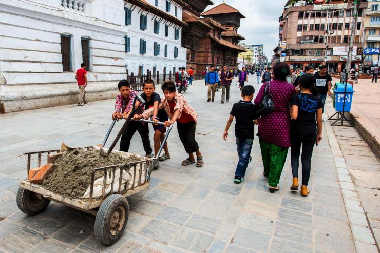 3个小孩推着砖头和水泥,加德满都的杜巴广场旁边的寺庙正在修葺。