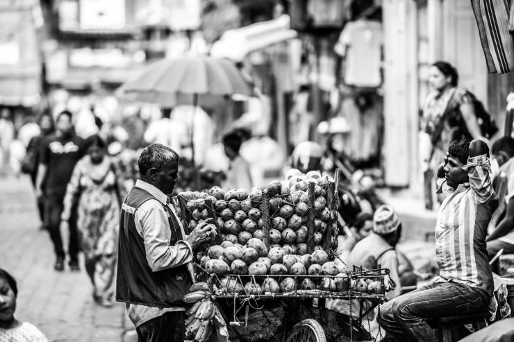 两位卖芒果的商贩在说着什么。