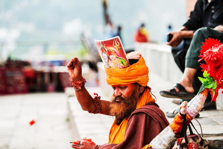 在加德满都猴庙,有位感觉像巫师的人,靠让游客拍照挣钱。
