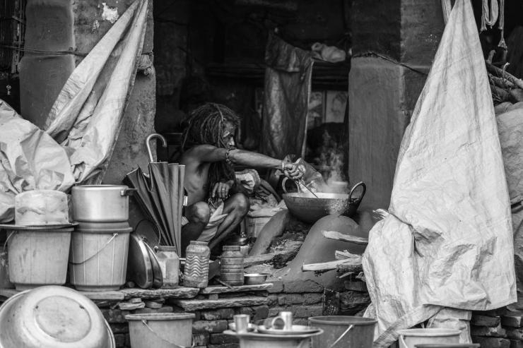 加德满都的烧尸庙,里面居住了很多这样的苦行僧。天热的时候苦行僧们集体在长廊的房檐下乘凉、聊天。天冷的晚上就会生起篝火,围在火堆旁边睡觉。他们把对生活的需求降低到最低的限度。睡觉枕着硬邦邦的砖头,身下只铺一块布或者干脆什么都没有。平时很少喝水,一日三餐均以一种像油茶面做成的半生不熟的面团为食。