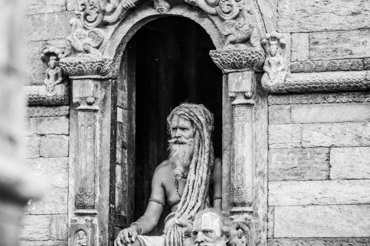 加德满都烧尸庙-苦行者端坐在自己修炼的小屋门口