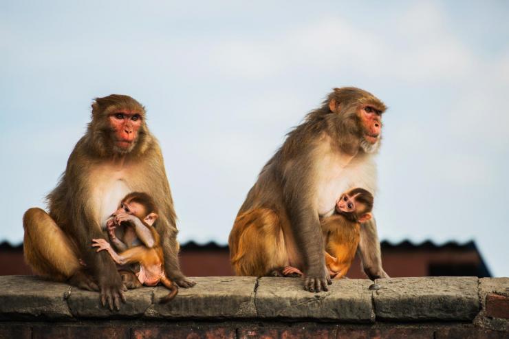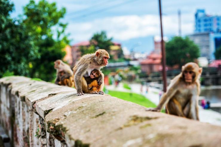 加德满都猴庙——猴子妈妈带着小猴在发呆,小猴嘴里都含着妈妈的奶嘴。