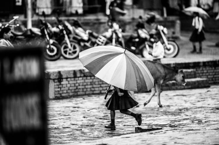 放学的时候,下着小雨,没有一个家长来接孩子放学。或许是因为太忙,或许是从小就培养孩子的独立性,所有的学生都或单、或成群结队的打着伞,步行回家。当这对小朋友从我旁边经过,我还在犹豫是不是因该记录下这个画面的时候,同行的朋友赶紧催促我要把这个画面拍下来。当我拿着相机冲到他们面前把镜头对准的时候,他们被我的突如其来给惊住了,不自觉的停下了脚步,呆呆的望着我。