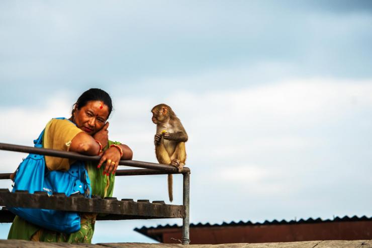 加德满都的猴庙,妇女在接听电话,小猴子就这样好奇的注视着她。