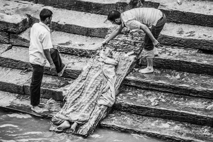 坐在烧尸台(恒河)对岸的人们。