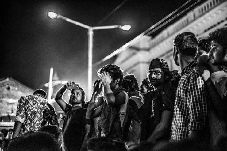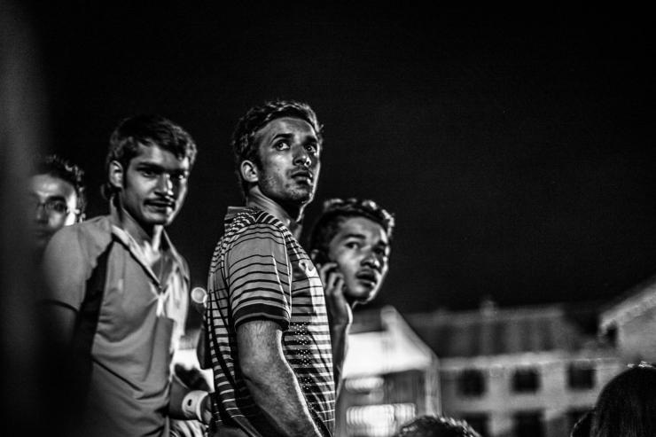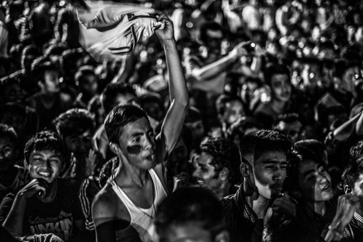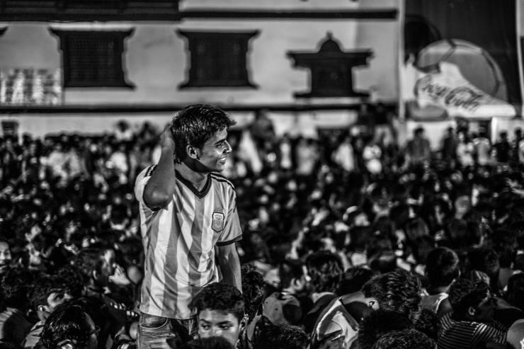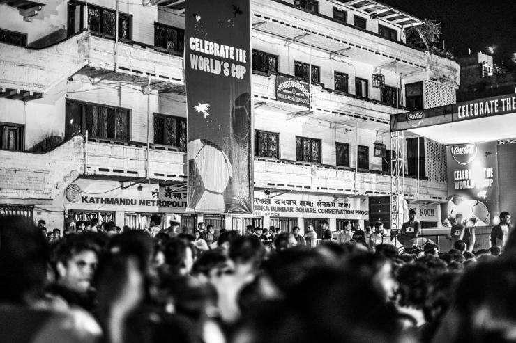 2014年世界杯决赛当晚,加德满都杜巴广场的露天看场,人满为患,在有序的组织下,人们整齐的席坐在地上等待决赛的打响(尼泊尔全民挺阿根廷)