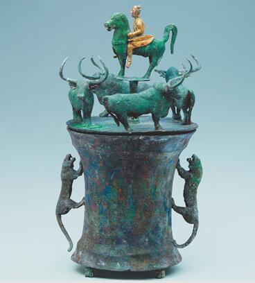 据《史记》《汉书》记载,滇是“椎结、耕田、有邑聚”的部落,滇池周围土地肥美,“有盐池田渔之饶,金银畜产之富”,“人俗豪忲,居官者富及累世”,反映在葬俗上便是统治阶级的厚葬风气。晋宁石寨山出土的“四牛鎏金骑士贮贝器”是云南青铜贮贝器中的佼佼者。该器为束腰筒形,双虎耳,三虎爪状器足,器盖中央是一小铜鼓,小铜鼓向上延伸成立柱,柱头为一长方形的小平台,台上有一滇族骑士椎髻跣足,佩剑骑马。骑士通体鎏金,显示出高贵的身份。平台四周环绕着四头巨角隆脊、雄健刚强的封牛作逆时针方向行走状。整件贮贝器造型优美,线条流畅,骑士、骏马、封牛、猛虎高低错落,气韵生动。高贵与矫健,雄强与威猛相互映衬。