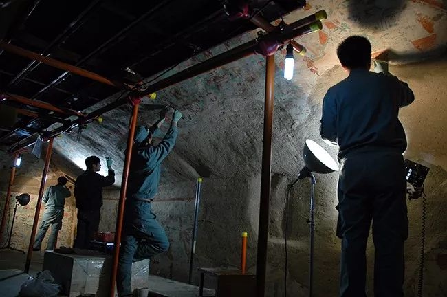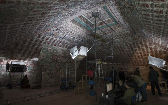 敦煌研究院正在莫高窟第61窟对壁画进行高分辨率摄影采集