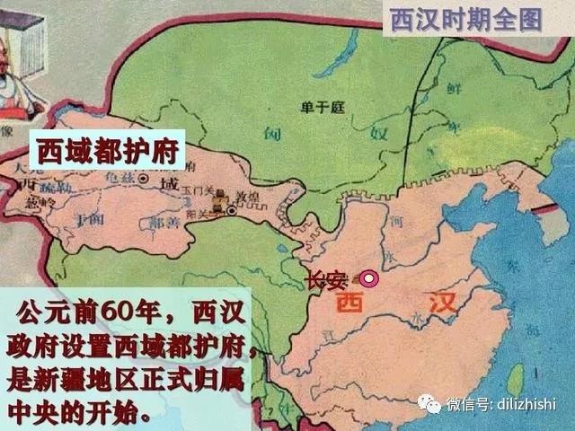 汉朝都护统制下狭义的 “ 西域” ,习惯上往往视为便是中国极西的新疆,实际并非完全相当。今日新行 政 区 划 界 线 之 内, 包 容 的 共 有四 个 自 然 单位:北方准噶尔盆地, 西北伊犁河谷, 中央天山山地, 与其南塔里木 盆地, 而狭义所称西域, 准噶尔盆地与伊犁河谷便从未被计列在内。