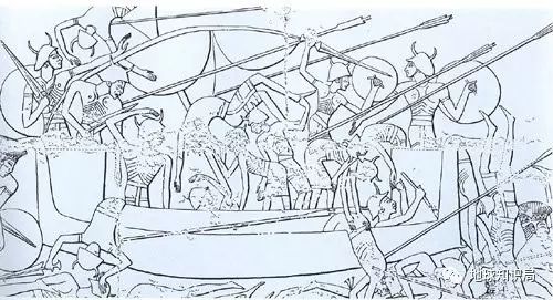 底比斯的Medinet Habu神庙雕塑详细纪录了拉美西斯三世与海上入侵者的尼罗河三角洲战役
