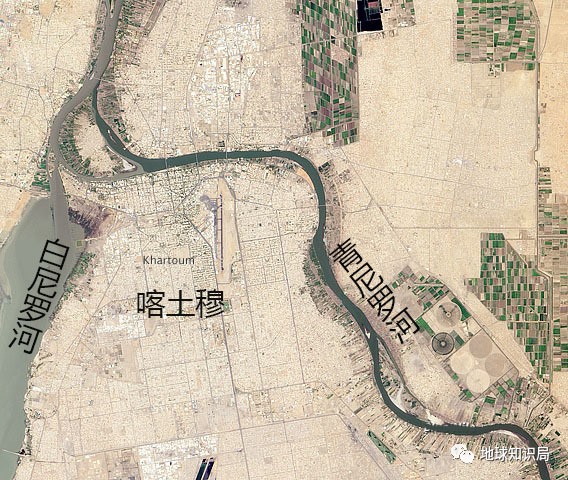 来自乌干达的白尼罗河与来自埃塞俄比亚的青尼罗河在喀土穆汇流