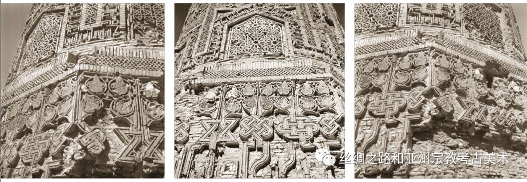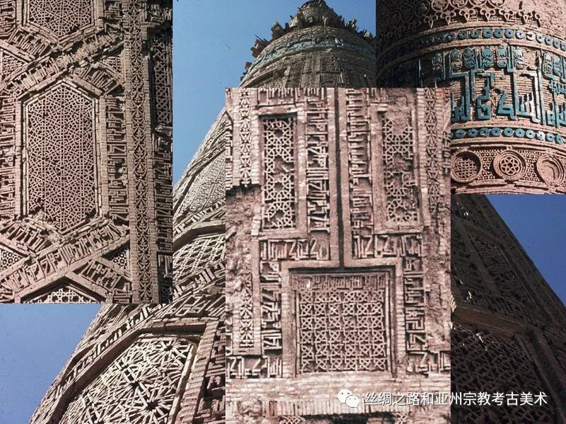 (塔身砖雕上的装饰有阿拉伯文库法体和誊抄体的文字书法、几何抽象图案与古兰经文等组成,立体的砖雕创造了光和影的美妙图案。塔身经文除了麦尔彦经文之外,还有两段出自古兰经的文字。古兰经铭文之间的区域被几何的镂空花纹所覆盖,每段铭文都用凸起的珍珠几何纹样中构成。©Warwick Ball)