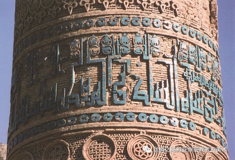 (1194年在古尔王朝苏丹Ghiyathal'din统治下建造尖塔,铭文是由凸起的饰带、凸起的绿松石色施釉圆圈组成,撰写使用库法体(一种古老的阿拉伯书法风格)铭文,经文是《古兰经》第十九章麦尔彦的全部内容,它讲述了先知的故事。全部976个字都以传统的库法字体写就,用小的雕花陶砖制成,经文下方的区域被几何镂空花纹所覆盖。©Warwick Ball)