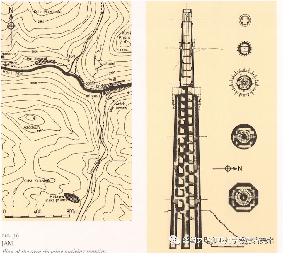 当然,贾姆塔塔身上的陶瓷铭文成为了重点研究对象,Maricq这个天才式的考古学家当时不仅破译了阿富汗境内最早的迦腻色迦的铭文,还对一些伊朗语系的铭文进行了整理,他和语言学家(Gaston wiet,1887~1971)两人在1958年整理出版了关于贾姆宣礼塔的考古报告,对塔身的铭文进行了解读。可惜的是这位天才的光芒并没有持续太久,34岁的Maricq就英年早逝了。贾姆宣礼塔的周边还有很多历史遗迹,可能与塔共同组建了某种礼仪性质的建筑群体,这些还没有来的及进行考察解读。