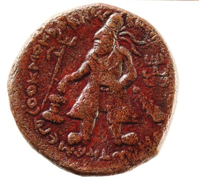 在贵霜早期的丘就却、阎膏珍阶段,制作发行的钱币几乎就是罗马钱币形式的翻版。在这一阶段的王权以借鉴罗马国王的形式来体现,而信仰表达似乎没有顾及到。