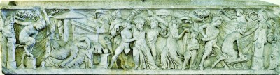 四是拱形门廊柱。驼囊场景上的拱廊柱子是在罗马式拱券门加上华丽雕刻,呈科林斯式倒置的铃状,构成了穹形拱顶华丽的装饰,展现出酒神站立不稳的身体,衬托出建筑视觉的关联。
