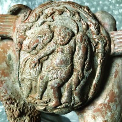 二是随从。狄俄尼索斯的随从也是他的信徒,以萨梯尔(Satyrs)和狂女为典型,驼囊上刻画了一男一女搀扶醉醺醺的狄俄尼索斯形象,侧旁的男子随从还手提鸭嘴胡瓶,似乎酒神刚从狂欢中退出来,符合其传统的艺术形象。