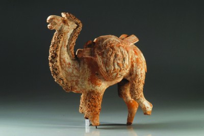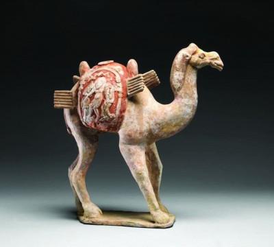 2000年美国大都会艺术博物馆收藏了一件彩绘陶驼俑(图④),有酒神狄俄尼索斯形象出现在驼囊上,美国研究人员认为这是中国唐代艺术品。经对比,可知大都会收藏的骆囊俑与西安隋墓考古出土骆驼俑在造型上完全一样。据说欧洲收藏者藏有两个驼囊酒神图像,进一步说明隋墓驼囊“醉拂菻”图像在当时的流行。