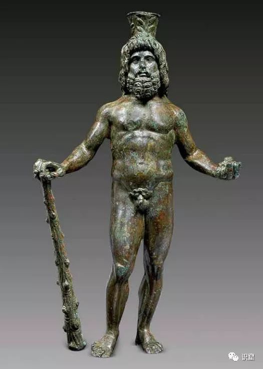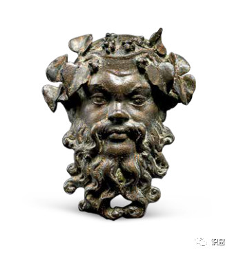 另一件美丽的铜器是西勒诺斯(Silenus)的面具,他通常呈现作头上戴着花环,肥胖而快活的老年男性形象;他是狄俄尼索斯的监护人、老师和随从。