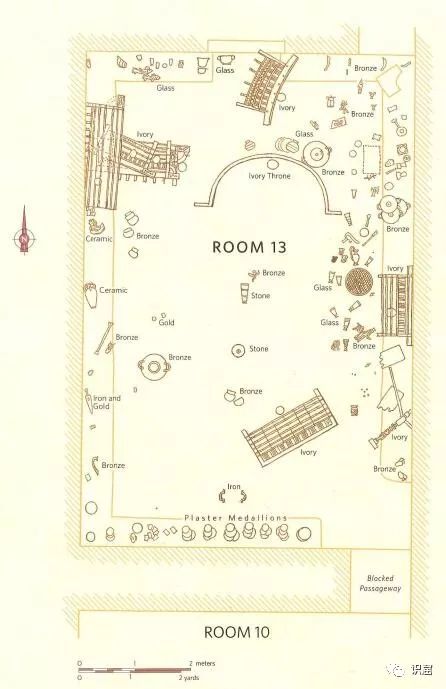 在10号房间发现的象牙和骨头物品以饰板为主,用于连接的小孔表明它们是用以组成脚凳外表的装饰层。另外,也找到了若干家具的腿好三件女性的雕像。它们的具体用途尚不明确,但有可能它们是组成某种家具的一部分。来自13号房间的精制雕刻品,明显是精致而复杂的椅子或长椅靠背的组成部分。这种椅背通常两面都有装饰。椅子上剩余的没能找到的部分,暗示了是由木头制成,长期埋在潮湿的土壤中而腐朽了。