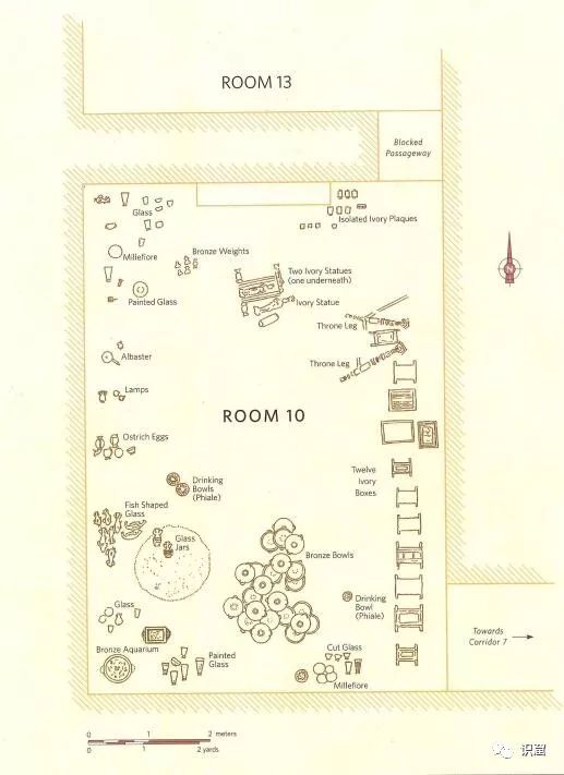 在1937年发掘的大部分房间都没有遇到令人惊叹的发现,直到发现了一个被砖块封堵住的古老的通道。它通向一个封堵的门(与二号遗址挖掘地类似的),在这扇门后是一个房间,里面有大量多元化而非凡的发现。在被编为10号的房间中,发现了大量罗马样式的玻璃制品,同样也有大量罗马的铜制品,包括盘子、半身像。在这扇门后是一个房间,里面有大量多元化而非凡的发现。在10号的房间中,发现了大量罗马式设计的玻璃制品,同样也有大量罗马铜制品,包括盘子、砝码或balsamaria(一种容器)的半身像和硬币,另外还有一个雪花石膏的晚餐盘和一个双耳瓶。还有大量风格上类似于古印度石雕的象牙和骨雕饰板,大概是木质结构的外层装饰,也可能是箱子或凳子上的。无论如何,随时间的推移,木头在潮湿的土壤中而被腐化分解,这就是为什么仅留存下骨骼和象牙的饰板与饰带。因为DAFA到别的地方挖掘去了,所以在1937年发现10号房间不久后便停止了发掘,并将这里荒废了将近一年。1938年,在新王城进行了更多的发掘,在它周边的地方也是如此。