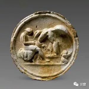 另外一个浮雕肖像石膏徽章中,美男子伽倪墨德正在给宙斯之鹰喂食。他和月之女神塞勒涅所爱慕并且每晚在特拉莫斯山拜访的恩底弥翁有得一比。许多学者认为,这些物品是由金属原件复刻的模型,并且是出自埃及的亚历山大城。其他学者则认为,他们是在贝格拉姆本土制造的。有些石膏徽章正面带有指纹的事实,表明它们不是装饰件,而是工坊使用的模型或是贸易货物的样品。