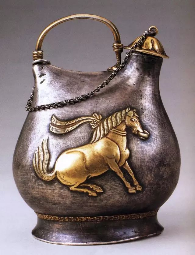 鎏金舞马衔杯纹银壶的造型采用了北方游牧民族使用的皮囊和马镫的综合形状,别具匠心。银壶制作精湛,提梁、盖及舞马纹饰均为鎏金,灿灿金色与灼灼银光交相辉映,色调分外和谐富丽。银壶上的舞马形象栩栩如生,更因其印证了史书中记载的玄宗驯养舞马祝寿的故事而弥足珍贵。