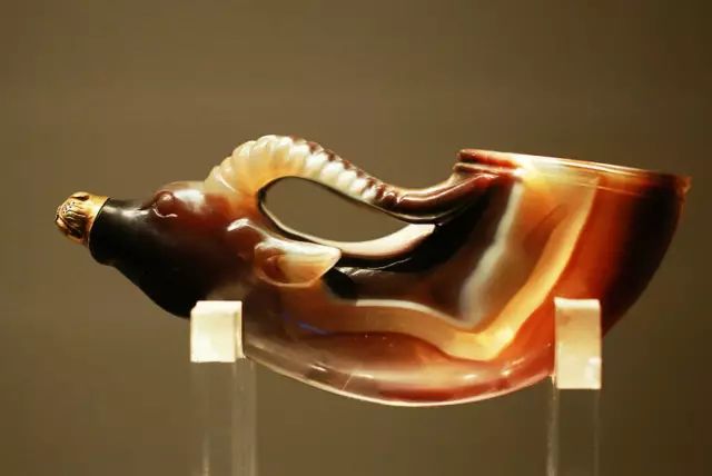 镶金兽首玛瑙杯,是至今所见唐代唯一的一件俏色玉雕,也是唐代玉器中做工最精湛的一件作品。此杯选用了世界上极为罕见的缠丝玛瑙琢制,而兽嘴镶金的工艺处理,不仅克服了兽嘴处材质色泽过深的不足,还使兽头的造型之美更为突出。
