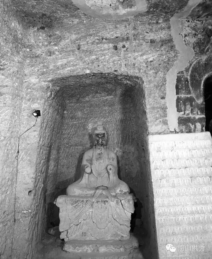 12窟为北周开凿的小型洞窟,四角攒尖顶账形洞窟,主要造像为七佛,布局紧凑合理。正壁主尊佛塑于龛内。两侧胁侍二菩萨。佛低平肉髻,面形方圆,身躯丰壮,双手扶于胸部。而胁侍带戴三珠宝冠,面庞圆润娇美,身挂长璎珞,身躯略扭,手捧供物。表现出北周造像珠圆玉润的特点。壁门两侧各塑一弟子像。